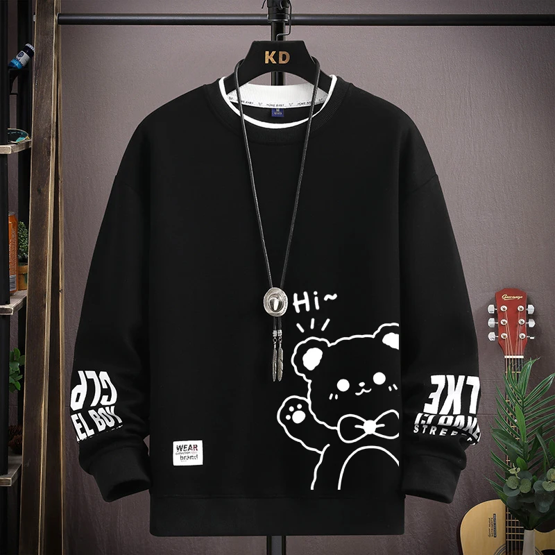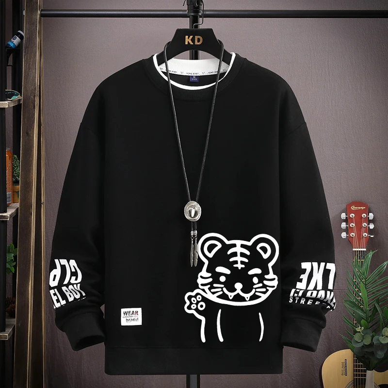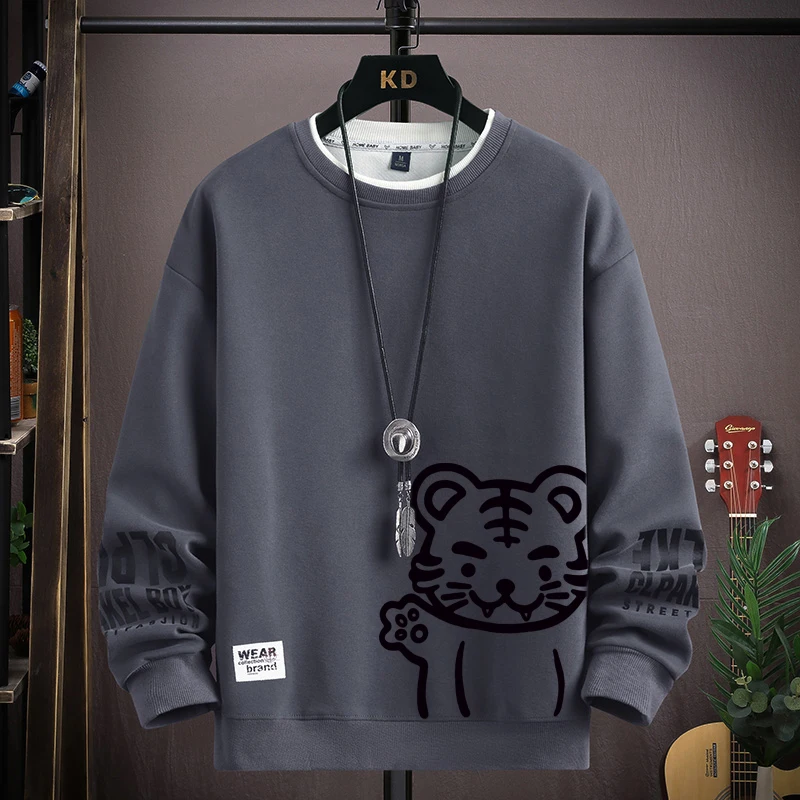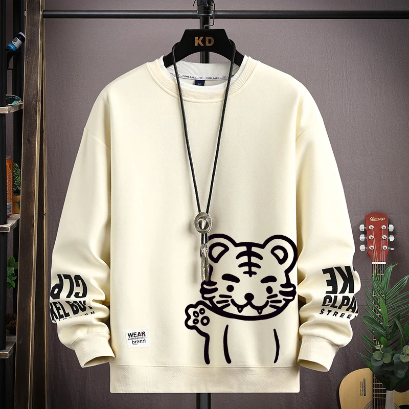 Japan Cartoon Men's Sweatshirt Hoodies Autumn Tiger Printed Long Sleeve T-shirt Fashion Men's Clothing Khaki O Neck Harajuku Top